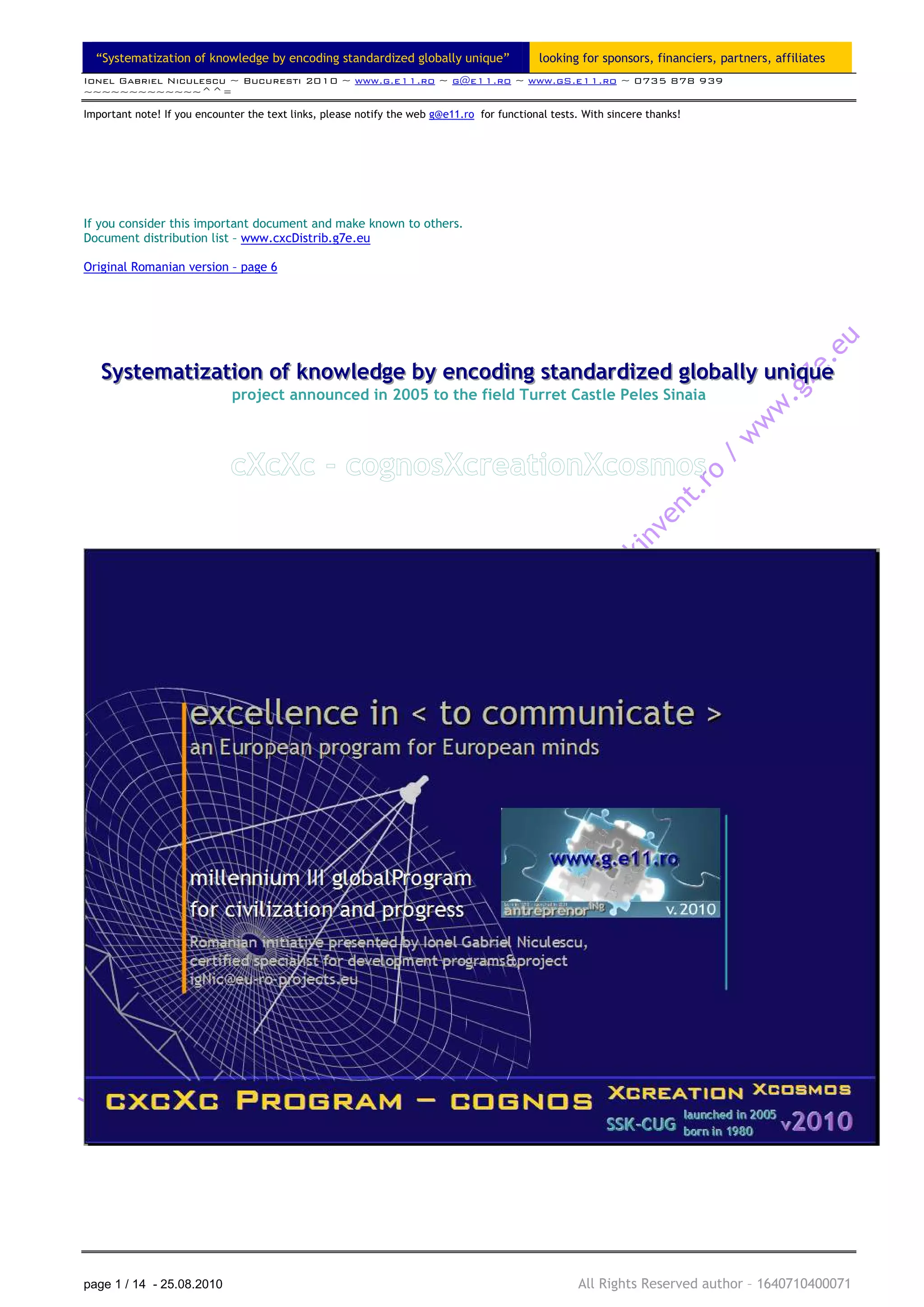 The document introduces a project called "Systematization of knowledge by encoding standardized globally unique". The main objectives of the project are to develop a standardized system and process to generate unique codes for identifying entities, locations, knowledge structures, and information. This system aims to efficiently store, manage, communicate, search and retrieve vast amounts of knowledge and information using short standardized codes.