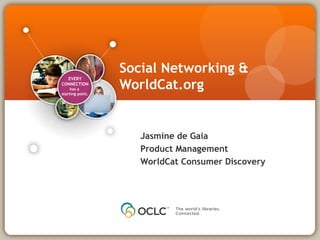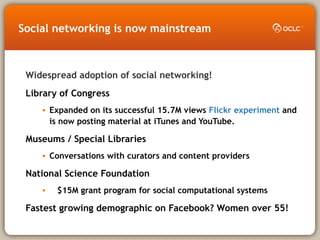 WorldCat.org aims to create a global online presence for libraries with three key objectives: raising awareness of libraries worldwide, increasing libraries' relevance by providing more access and value to users, and connecting users both physically and online to libraries and their services. The strategy is to drive traffic to WorldCat.org which will then connect users to libraries and help provide value in order to generate more usage of libraries. Social networking is now mainstream and libraries are expanding their online presences on platforms like Flickr, iTunes, YouTube to have conversations with users.