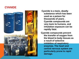 Cyanide is a highly toxic substance that prevents oxygen transfer in the blood and tissues, rapidly damaging the heart and nervous system. It can be inhaled, swallowed, or absorbed through skin. Symptoms of cyanide poisoning include rapid breathing, weakness, nausea, and loss of consciousness. There is no antidote, so prevention and rapid medical treatment are important if exposed.