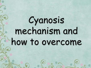 Cyanosis is a blue discoloration of the skin and mucous membranes caused by low oxygen levels in the blood. There are two main types - peripheral cyanosis, caused by reduced blood flow and seen in the extremities, and central cyanosis, caused by issues with oxygenation in the lungs or mixing of arterial and venous blood with low oxygen saturation systemically. Peripheral cyanosis can be improved by warming the skin, while central cyanosis requires treatments like oxygen therapy, surgery for congenital heart defects, intravenous fluids, or diuretics to manage fluid accumulation. The document discusses the mechanisms, causes, signs, and treatments of both peripheral and central cyanosis in detail.