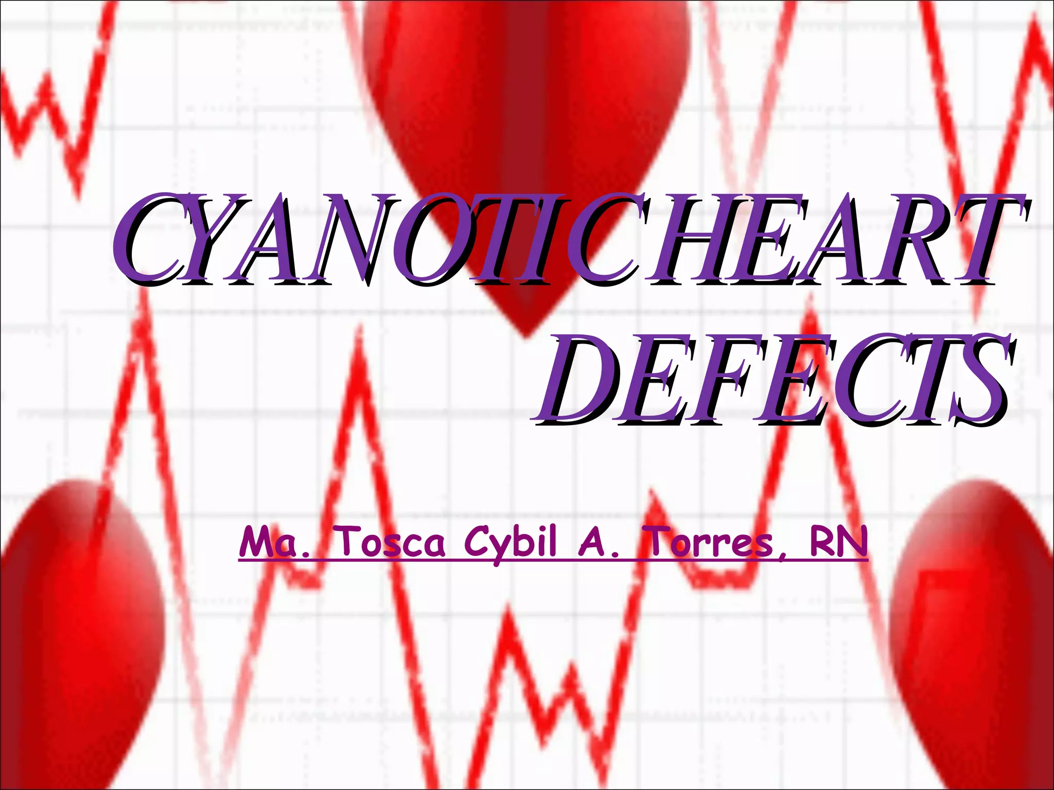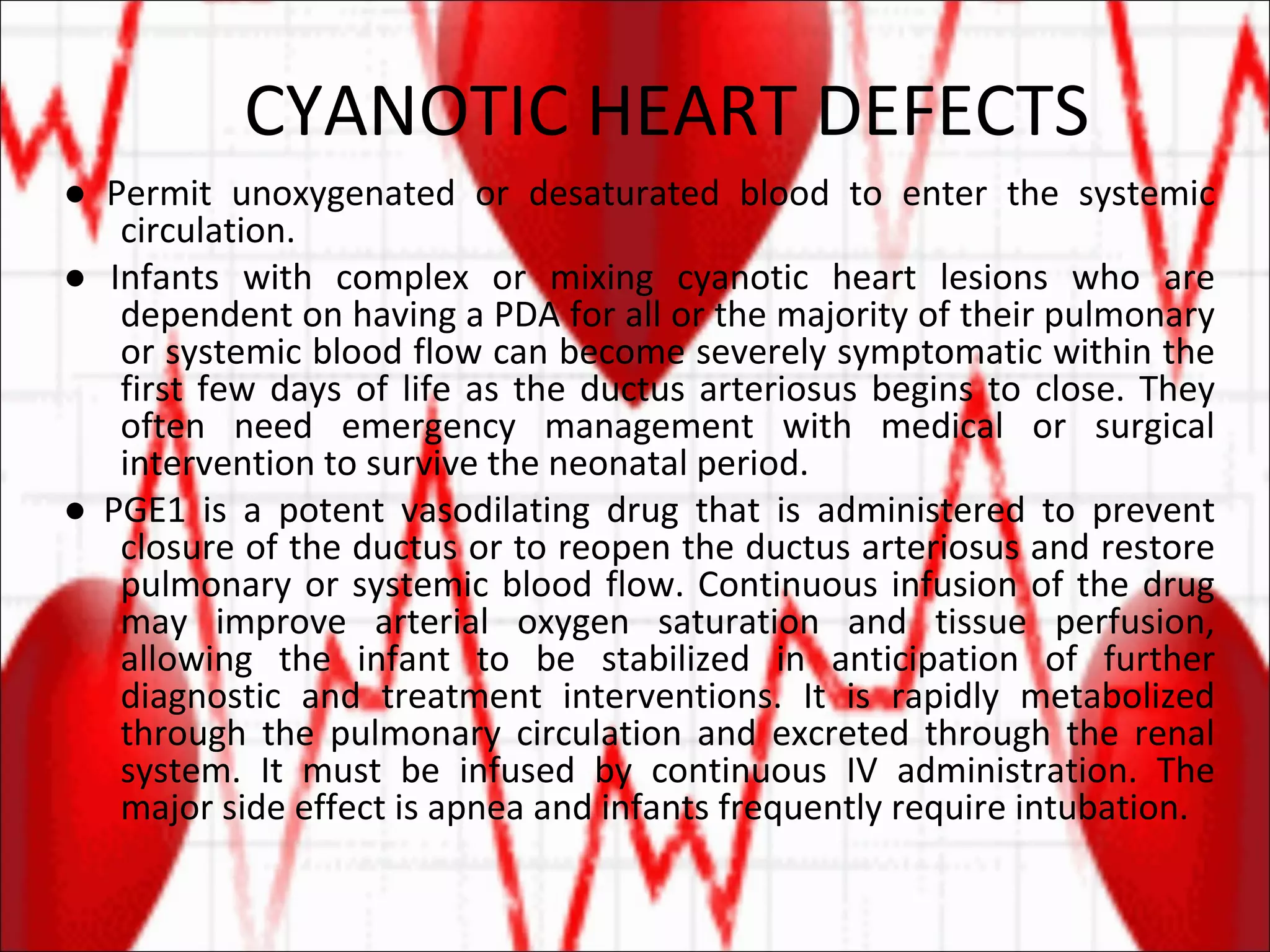 Cyanotic heart defects allow unoxygenated blood to enter the systemic circulation, causing cyanosis (blue skin). Infants with defects dependent on a patent ductus arteriosus for blood flow can deteriorate quickly as the ductus closes, requiring medical intervention. Prostaglandin E1 preserves ductal patency and improves oxygen levels. Long-term management may involve surgical procedures like shunt placement or defect repair. Uncorrected defects can lead to complications such as polycythemia, anemia, clotting issues and hypercyanotic episodes.