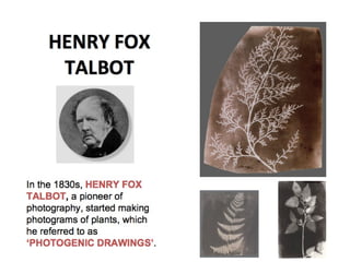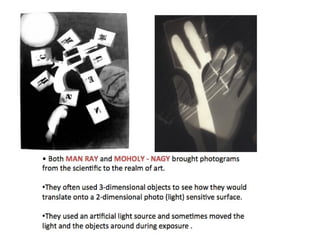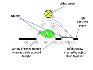 This document provides information about cyanotype photography and examples. It discusses: