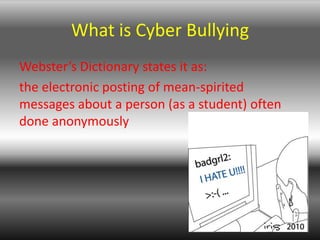 Cyber bullying is defined as mean-spirited or harmful messages posted online about another person, often done anonymously. It differs from traditional bullying in that it can be done anywhere on the internet and the bully can remain anonymous. Cyber bullying can seriously hurt victims and should be stopped, as any type of bullying that damages others is unacceptable.