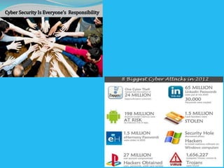 Cybersecurity involves protecting computers, networks, programs, and data from digital attacks. It includes topics like hacking, denial of service attacks, cyber terrorism, and software piracy. Some key aspects of cybersecurity are using antivirus software, anti-spyware, firewalls, secure passwords, and maintaining regular backups to protect private information and systems from viruses, malware, and unauthorized access. Understanding different types of hackers like white hat, grey hat, and black hat is also important for cybersecurity.