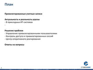 Документ описывает угрозы и управление привилегированными учетными записями в IT-системах, подчеркивая важность защиты от кибератак. Он включает в себя анализ для контроля доступа и мониторинга использования, а также предлагает решения для борьбы с рисками, связанными с привилегированными аккаунтами. Документ также выделяет необходимость соответствия нормативным требованиям и рекомендует внедрение методов защиты, такие как автоматизация управления учетными записями и углубленный анализ угроз.
