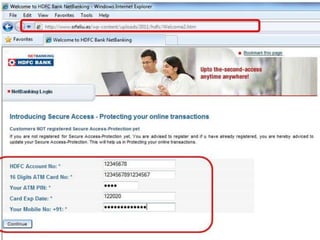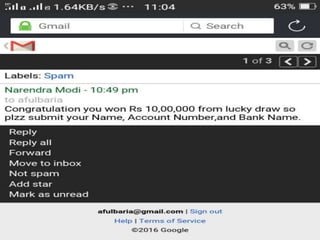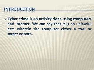 The document discusses various types of cyber crimes, including hacking, email fraud, and cyber terrorism, emphasizing the role of computers and the internet in facilitating these unlawful activities. It offers safety tips, such as using antivirus software and checking the authenticity of websites and emails to protect against cyber threats. The importance of personal security and awareness in safeguarding against cyber crimes is also highlighted.