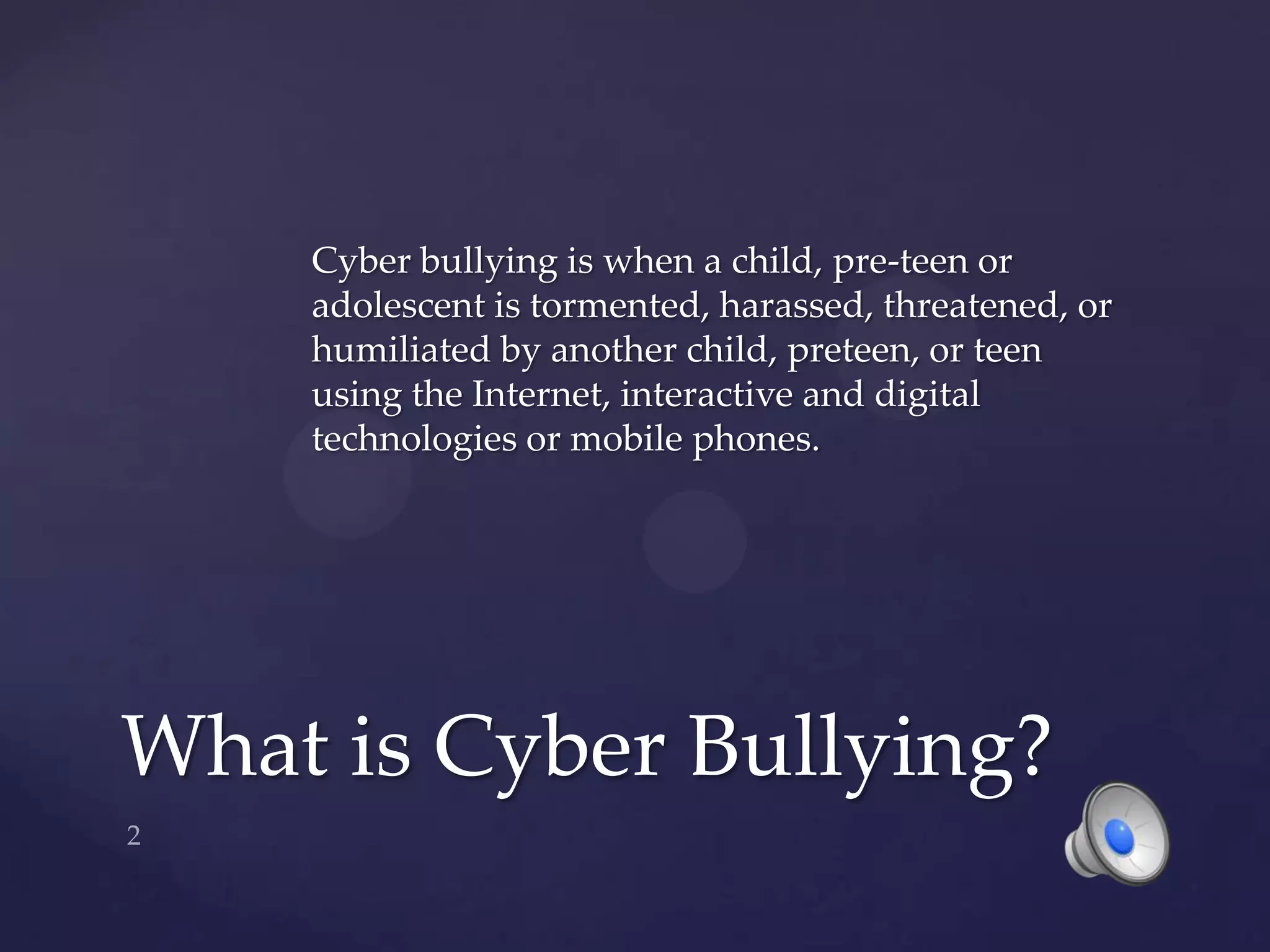 Cyber bullying involves tormenting, harassing, threatening, or humiliating another child or teen using the internet, technology, or mobile phones. It can take many forms, such as sending mean texts and emails, posting embarrassing photos online, or creating fake social media profiles. Cyber bullying is dangerous and can lead to anxiety, depression, and even suicide. While teens may think using fake names prevents getting caught, there are ways to track cyber bullies. Most states currently do not have laws specifically targeting cyber bullying, so awareness is important for prevention.