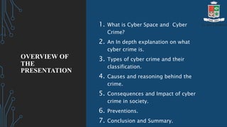 This presentation covers cyber crime, including an overview of cyber space and cyber crime, types and classifications of cyber crimes, causes behind cyber crimes, impacts on society, and methods of prevention. Specific cyber crimes discussed include hacking, identity theft, malware, and online scams. The presentation explains that cyber crime threatens individuals, organizations, and national security through financial fraud, data theft, and cyber attacks. It also notes the significant impacts of cyber bullying on youth. Lastly, the presentation outlines strategies countries like Bangladesh have taken to strengthen cyber security and combat cyber crime through legislation, enforcement, and educational initiatives.