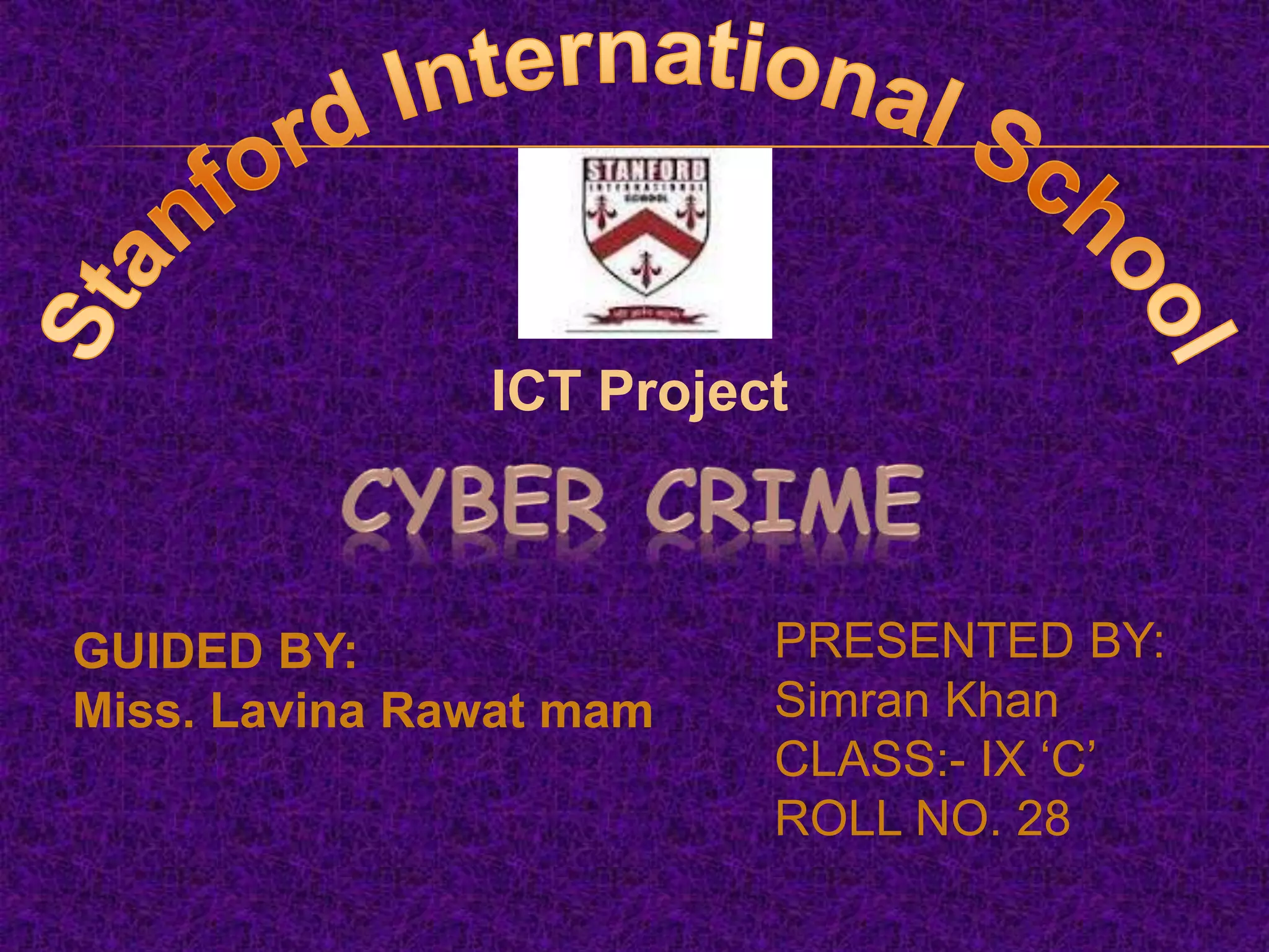 This document discusses cyber crime and security. It begins with an introduction to cyber crime and a brief history highlighting some early cyber crimes. It then categorizes cyber crimes as those using computers as targets or weapons. Several types of cyber crimes are outlined such as hacking, child pornography, denial of service attacks, and software piracy. The document notes that cyber crimes threaten national security and discusses cyber security advantages and safety tips. It concludes with an overview of India's cyber laws.