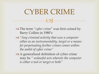 The document discusses cyber crime and the legal provisions around it in India. It begins by defining cyber crime and noting that the term was first coined in the 1980s. Cyber criminals can include children, organized hackers, professional hackers, and discontent employees. Common cyber crimes include hacking, theft of electronic information, email bombing, and denial of service attacks. The Information Technology Act of 2000 is the primary legislation dealing with cyber crimes in India. It identifies offenses such as unauthorized access, publishing obscene material, and tampering with computer source documents. Notable cyber crime cases in India include the DPS mms case and the Air Force school mms case. Prevention involves using antivirus software, backups, and being wary of personal information