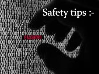 Cybercrime involves using computers or the internet to steal identities or import illegal programs. The first recorded cybercrime took place in 1820. There are different types of cybercrimes such as hacking, denial of service attacks, computer viruses, and software piracy. Cybercrimes also include using computers to attack other systems, commit real-world crimes, or steal proprietary information. Common cyber attacks include financial fraud, sabotage of networks, theft of data, and unauthorized access. Internet security aims to establish rules to protect against such attacks by using antivirus software, firewalls, and updating security settings regularly.