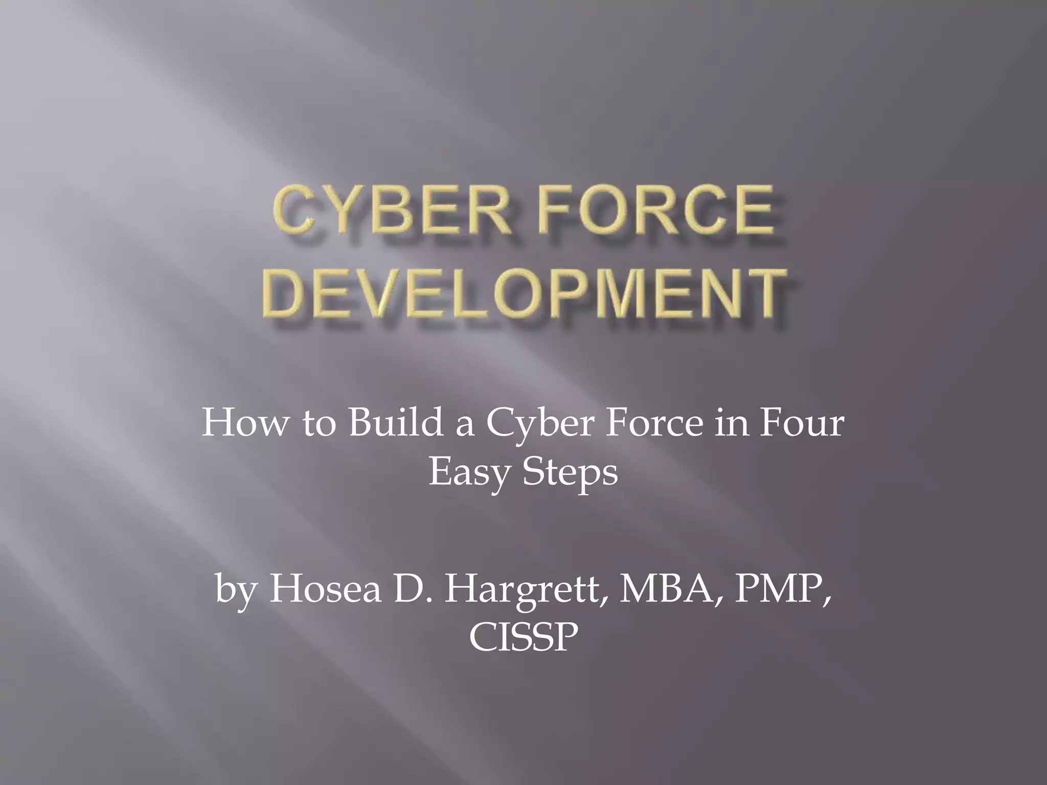 The document outlines a four step process to build a cyber force: 1) develop a cyber strategy, 2) write cyber policy, 3) conduct cyber training, and 4) create cyber capability. The strategy focuses on systems protection, infrastructure, military and civilian needs. Policy includes standards, guidelines. Training assesses skills and closes gaps for current and future threats. Capability deploys defense and offense cyber operations.