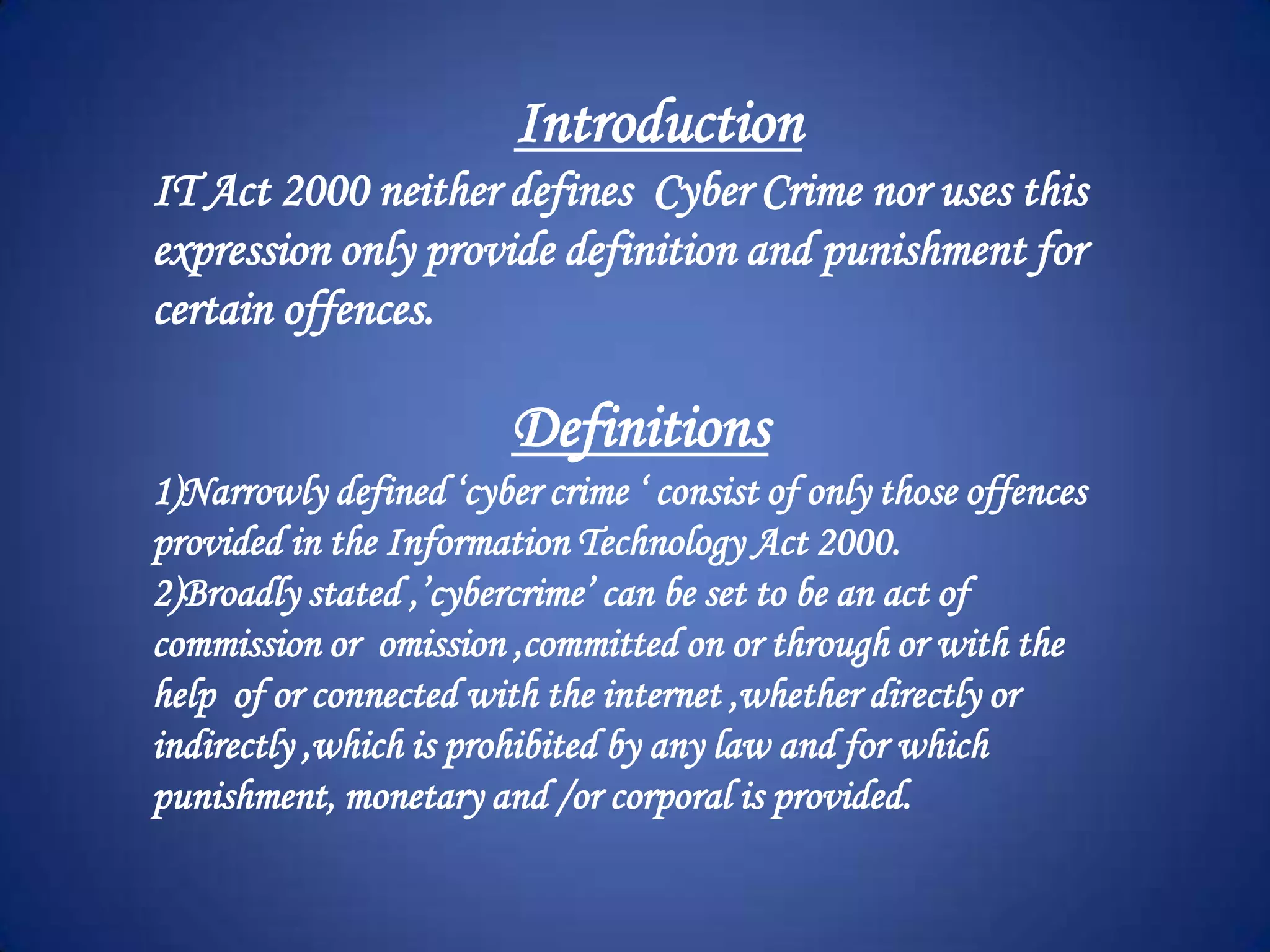The document discusses cyber crime and the IT Act in India. It defines cyber crime narrowly as offenses outlined in the IT Act and broadly as illegal acts using the internet. Cyber crimes are classified as old crimes committed online, new internet-created crimes, and using the internet to enable old crimes. The IT Act covers hacking, cyber pornography, and cyber fraud. It discusses provisions for tampering with computer source code, cyber terrorism, and defines key cyber crimes and offenses under the act. It also provides tips for individuals and organizations to prevent cyber crimes like using strong passwords, firewalls, and keeping systems updated.