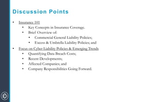 The document presents an overview of insurance concepts, focusing on various types of liability policies including cyber liability, and discusses the growing importance of managing cyber risks and data breach impacts for businesses. It elaborates on key coverage elements, placement best practices, and emerging trends in the context of recent significant data breaches. Additionally, it emphasizes the necessity for companies to implement effective risk management strategies and ensure appropriate insurance coverage to mitigate potential liabilities.