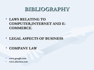 This presentation covers cyber laws in India. It introduces the need for cyber laws to tackle cyber crimes and protect intellectual property rights. The main cyber law passed in India is the Information Technology Act of 2000 (ITAct). The ITAct provides legal validity for electronic communication and commerce, digital signatures, and allows for e-governance. The presentation defines various cyber crimes like crimes against persons using viruses, crimes against property like hacking, and crimes against the government. It also discusses cyber crimes facilitated by social media and the negative effects of online pornography. Overall, the presentation argues that cyber laws are essential in today's internet-connected world to achieve global peace and harmony.