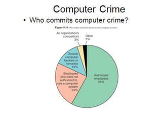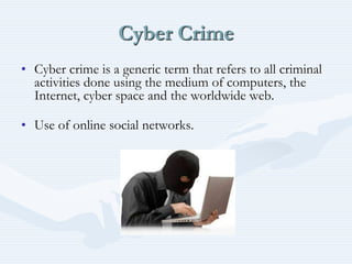 Cyber laws and cyber crimes are discussed. Cyber law refers to legal issues related to communications technology and the internet. The Information Technology Act was passed in 2000 in India to recognize electronic transactions and facilitate electronic filing. Cyber crimes include hacking, data theft, spreading viruses, identity theft, and email spoofing. The IT Act and Indian Penal Code sections apply to cyber crimes and outline punishments such as imprisonment and fines. Cyber laws are needed to tackle cyber crimes and protect intellectual property rights in today's internet-reliant world.