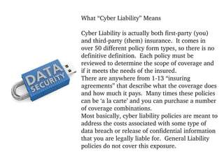Cyber liability insurance encompasses both first-party and third-party coverage, with policies varying significantly in form and insuring agreements. It aims to address costs related to data breaches and unauthorized disclosure of confidential information, which are not covered by general liability insurance. Capitol Special Risks, a specialized insurance brokerage, offers a range of tailored coverages in this field, utilizing their expertise to secure enhanced options for clients.