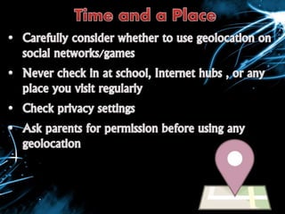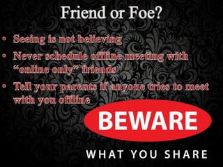 This document provides tips for staying safe online, including when using social media. It advises guarding personal information from being shared publicly. When communicating online, children should avoid chatting with unknown adults and only share photos and information with trusted friends and family. The document also defines cyberbullying and how predators use manipulation tactics online. It concludes by offering strategies for protecting yourself such as being wary of suspicious emails and only sharing sensitive information on secure websites.