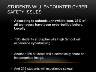 This document summarizes a presentation given to students at Stephenville schools about cyber safety and cyberbullying. It discusses how 33% of teenagers have experienced cyberbullying. Specifically, it was reported that 183 students at Stephenville High School may experience cyberbullying, 269 may electronically share inappropriate images, and 215 may experience sexual solicitation. The presentation covered topics like detecting online predators, sharing too much personal information online, sexting, cyberbullying, and inappropriate online content. It provided statistics on cyberbullying and stressed the importance of being careful online and getting help from trusted adults if feeling threatened or bullied.