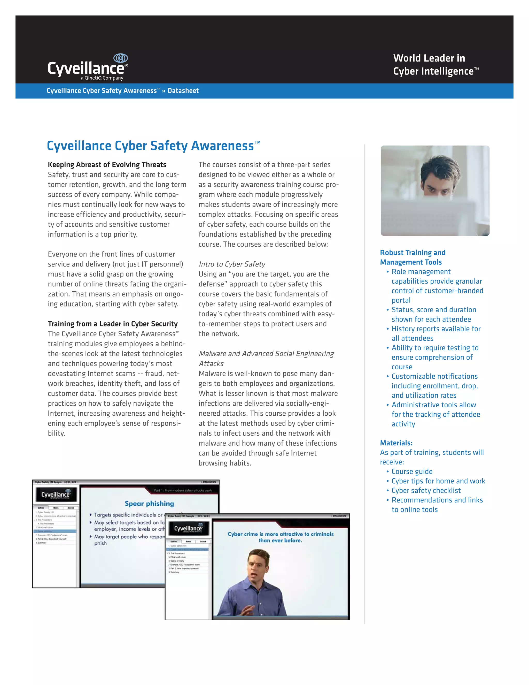 Cyveillance offers a comprehensive Cyber Safety Awareness training program designed to educate employees about evolving online threats and cybersecurity best practices. The training consists of a multi-part series that helps users understand various types of cyber attacks, including phishing and identity theft, while equipping them with actionable strategies for protection. By enhancing employee awareness and skills, the program aims to improve overall security within organizations and build customer trust.