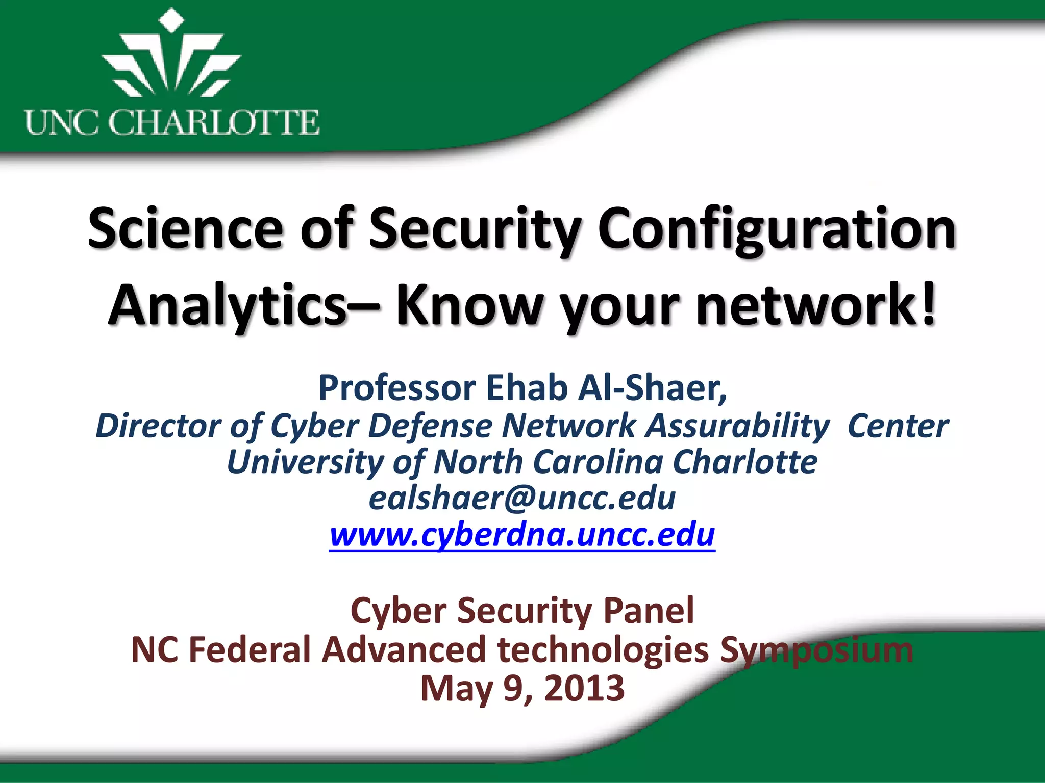 The document summarizes a cyber security panel discussion held on May 9, 2013 in North Carolina. It provides background on the event sponsors and introduces Professor Ehab Al-Shaer, the director of the Cyber Defense Network Assurability Center at UNC Charlotte, who presented on security configuration analytics. It also briefly describes Al-Shaer's research at UNC Charlotte focusing on security configuration verification and risk estimation.