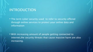 This document discusses cyber security and the various threats to online data and systems. It defines cyber as relating to information technology and the internet. Cyber security helps secure data from theft or misuse and protects systems from viruses, hackers, malware, Trojan horses, and password cracking. Common cyber threats include viruses that infect files and boot sectors, as well as overwrite data. Solutions involve installing antivirus software. Hackers can be white, grey, or black hat with white hats helping security and black hats stealing data illegally. Malware is malicious software that damages systems covertly. Strong passwords and firewalls help prevent hacking and downloading malware and Trojans.