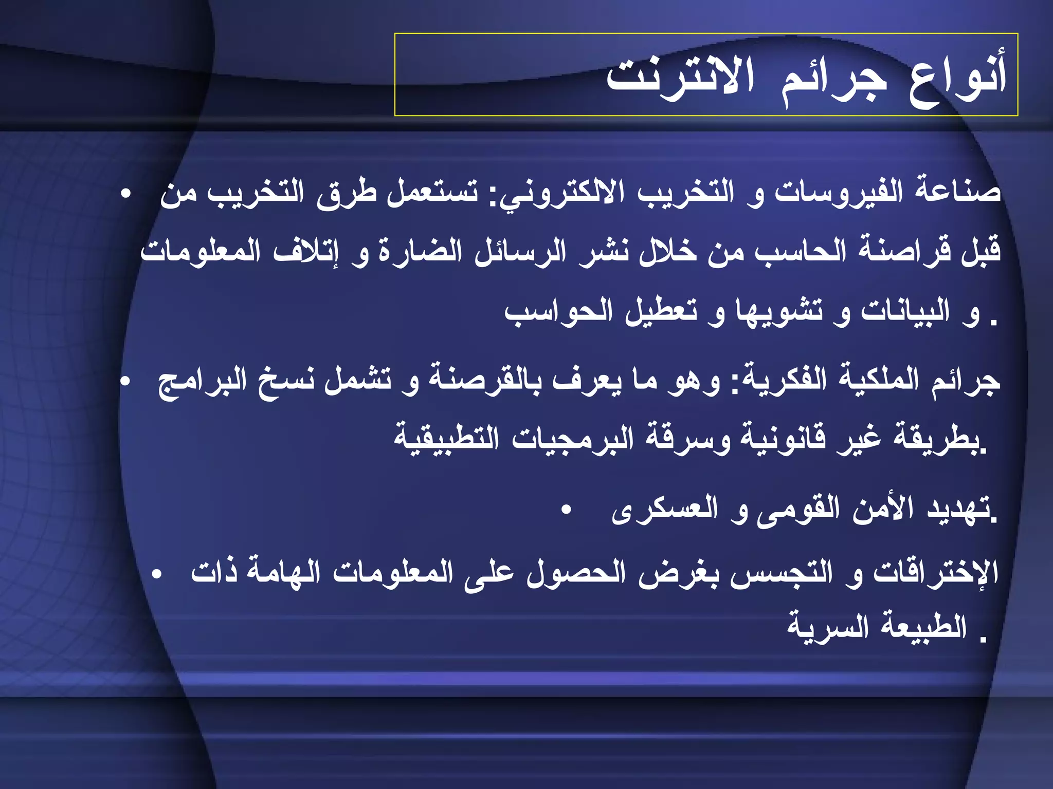تناقش الوثيقة أنواع جرائم الإنترنت، بما في ذلك القرصنة، الاختراقات، والنصب، كما تقدم نصائح للحماية من هذه الجرائم مثل استخدام برامج الحماية وتجنب المواقع المشبوهة. كما تشير الوثيقة إلى مخاطر إدمان الإنترنت وتأثيرها السلبي على الشباب، وتقدم اقتراحات للوقاية من هذه الأضرار من خلال تعزيز القيم الأسرية ومراقبة سلوك الأبناء.
