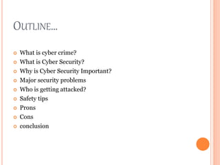 The document outlines the concepts of cyber crime and cyber security, emphasizing their significance in protecting data and national security. It discusses major security issues like viruses and hacking, provides safety tips, and highlights the pros and cons of cyber security. The conclusion suggests that understanding and implementing cyber security measures is crucial due to emerging threats.
