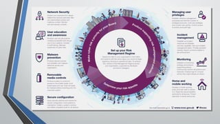This document discusses cyber security. It begins by defining cyber security as the body of technologies, processes, and practices designed to protect networks, devices, programs, and data from attacks, damage, or unauthorized access. It notes that cyber security is important because organizations collect, store, and process unprecedented amounts of data that needs protection. Some common cyber threats discussed include cyberterrorism, cyberwarfare, cyberspionage, and attacks targeting critical infrastructure, networks, applications, cloud systems, and internet of things devices. The document also examines cyber attack life cycles and common prevention methods.