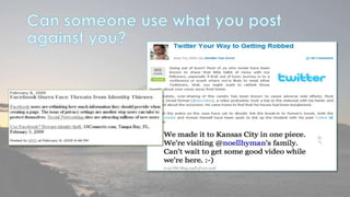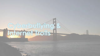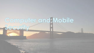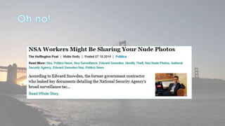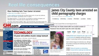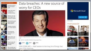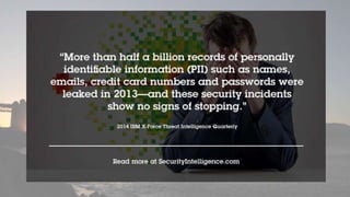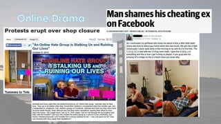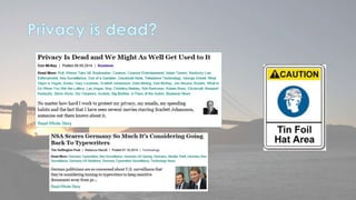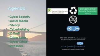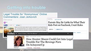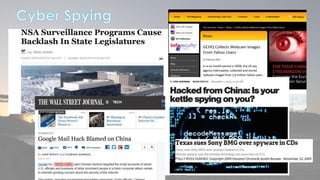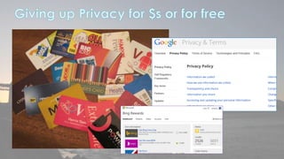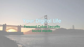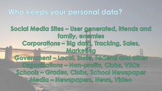This document discusses cyber security issues related to social media and personal information online. It notes that the amount of data created annually has grown exponentially and this data can remain online for years. Both personal profiles created by individuals and those created about people by others shape their online reputation. The document warns that employers, insurers, and other parties increasingly check social media and that anonymity online allows false posts that can damage credibility. Various risks of oversharing personal information are outlined, as are strategies to monitor and control one's online profile and reputation.
