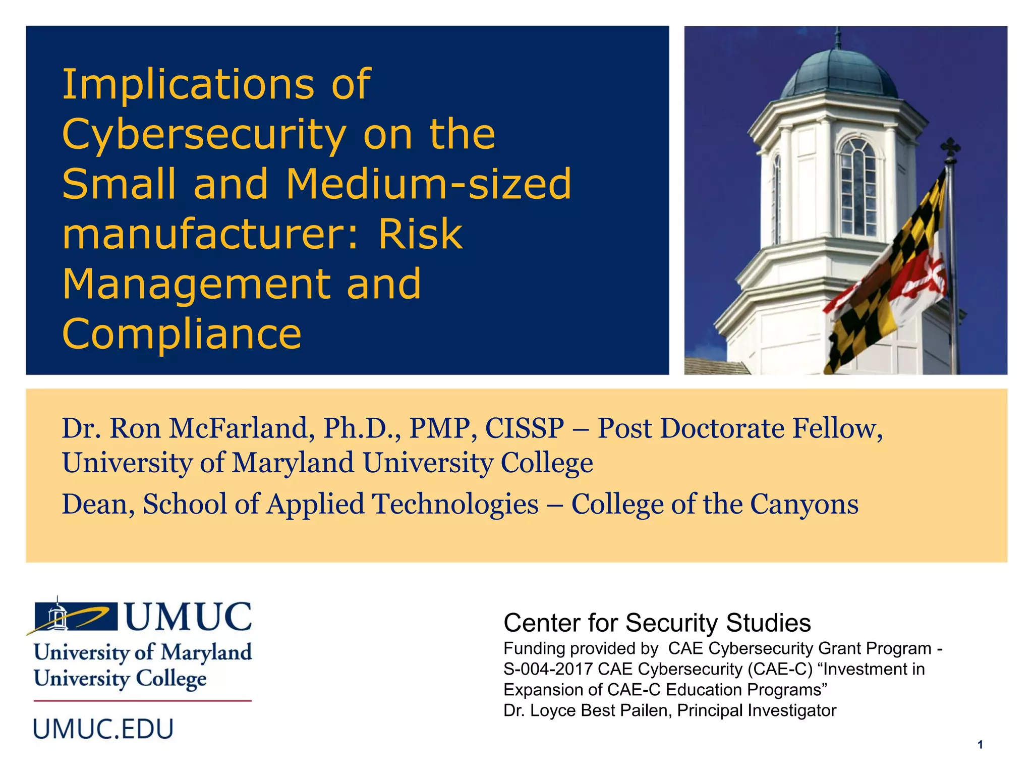 1. The document discusses implications of cybersecurity for small and medium manufacturers, including risk management and compliance requirements.