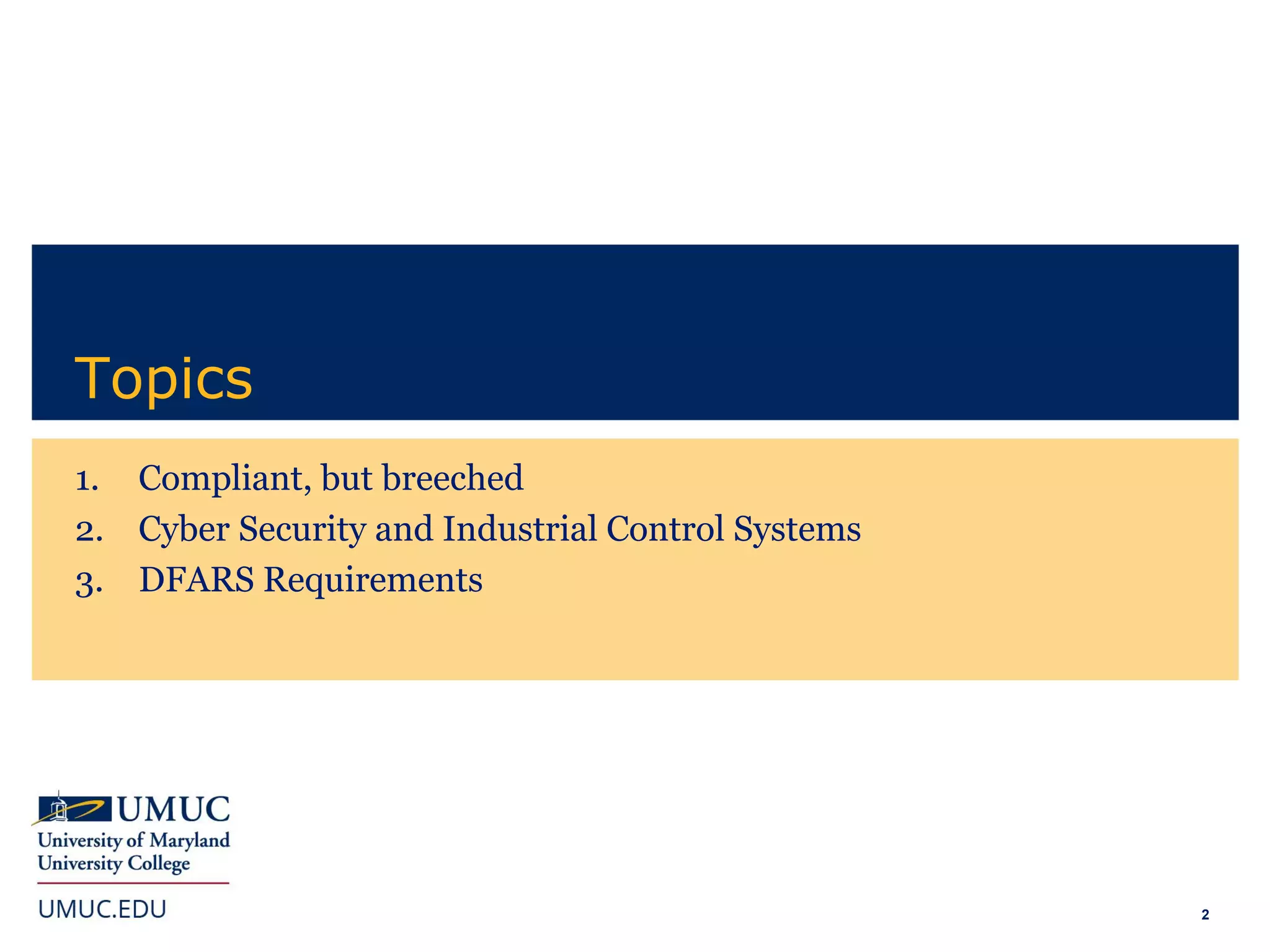 2. It covers topics like being compliant with certifications but still being breached, cybersecurity for industrial control systems, and Department of Defense Federal Acquisition Regulation Supplement (DFARS) requirements.