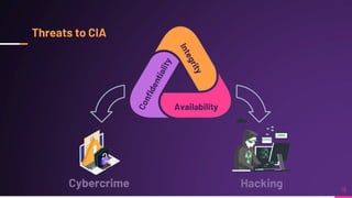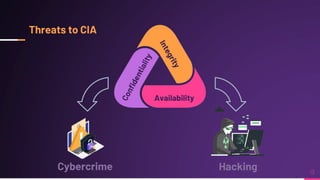 Cyber security involves protecting networks and devices from attacks and unauthorized access to ensure confidentiality, integrity, and availability of information. Cybercrime encompasses illegal activities using computers or networks, often for profit, including fraud, malware dissemination, and data theft. Cybersecurity experts are critical in safeguarding organizations against these threats.