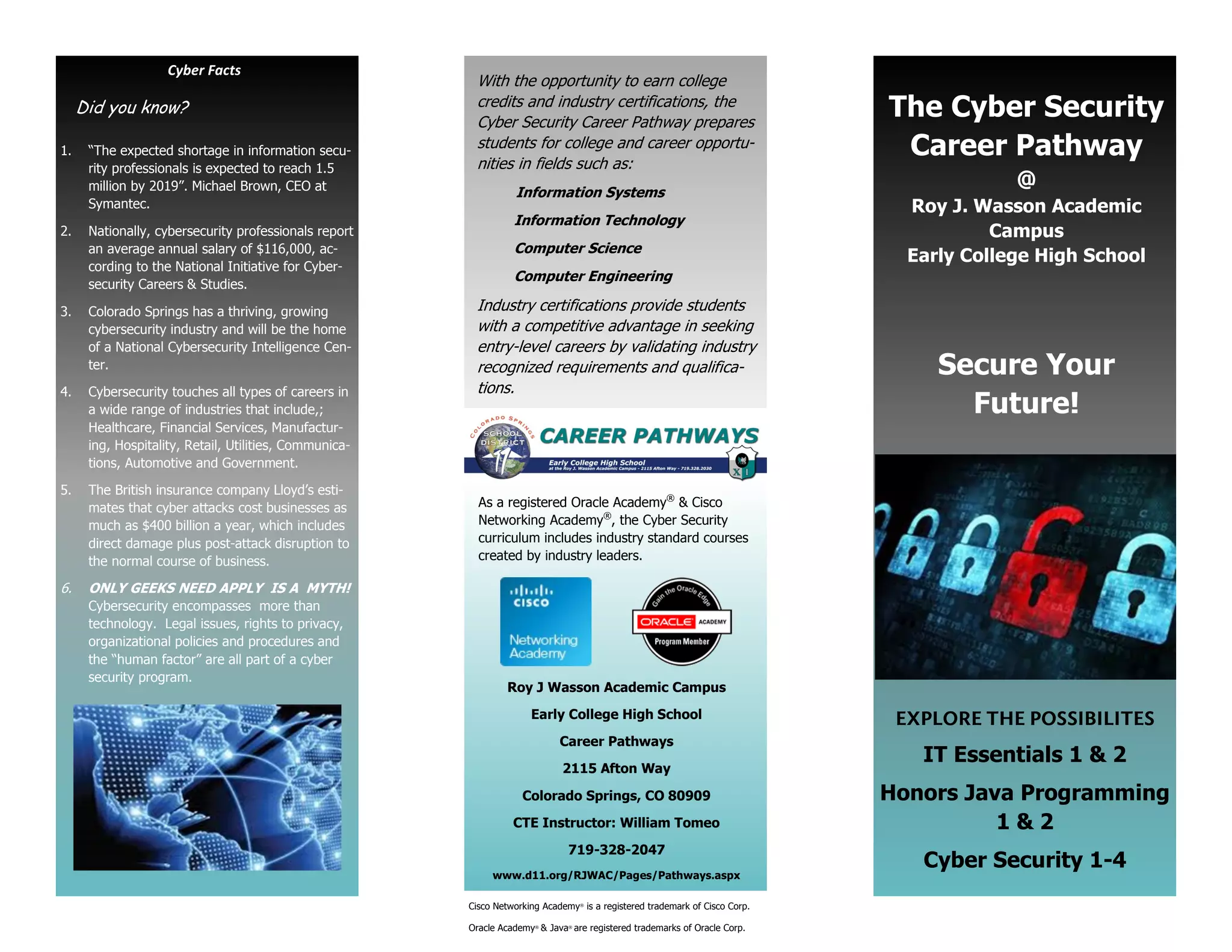 This document provides information about cybersecurity career pathway courses offered at the Roy J. Wasson Academic Campus Early College High School. The courses include IT Essentials 1 & 2, Honors Java Programming 1 & 2, and Cyber Security 1-4. These courses cover fundamentals of computer hardware, software, programming, networking, and security. Students can earn college credits, industry certifications, and prepare for careers in fields like information systems, information technology, and computer science.