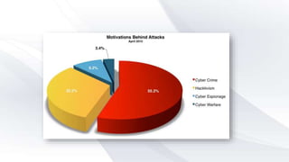 This document discusses cyber crime and security. It begins with an overview of topics to be covered, including the history and basics of cyber crimes, various categories of cyber crimes, and motivations for cyber attacks. It then discusses the history of cyber crimes and defines cyber attacks and cyber crimes. Various types of cyber crimes are outlined, including those against persons, property, and government. Common cyber crime techniques like social engineering, viruses, and ransomware are explained. The document notes that cyber crime groups are starting to operate more like organized crime rings. It concludes by discussing how opportunities provided by Web 2.0 technologies can be exploited for cyber crimes.