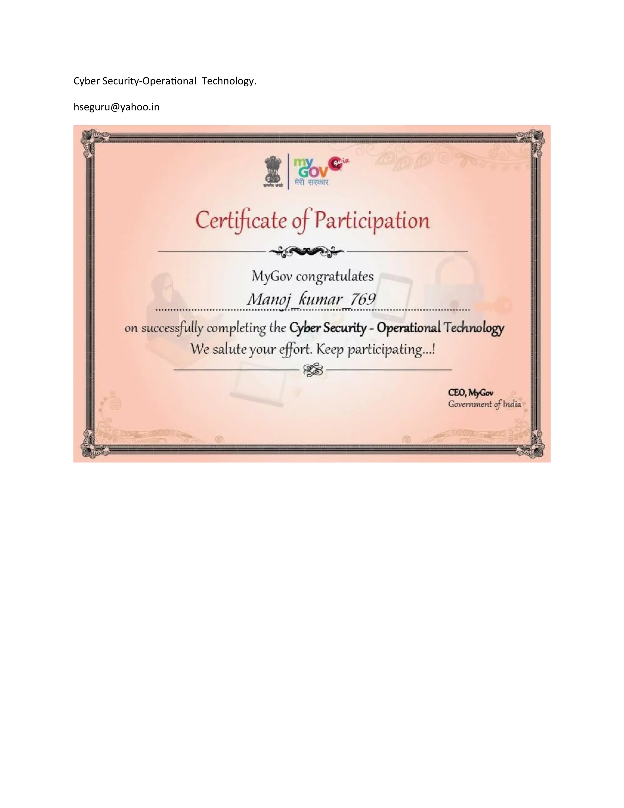 Cyber Security-Operational Technology. hseguru@yahoo.in
