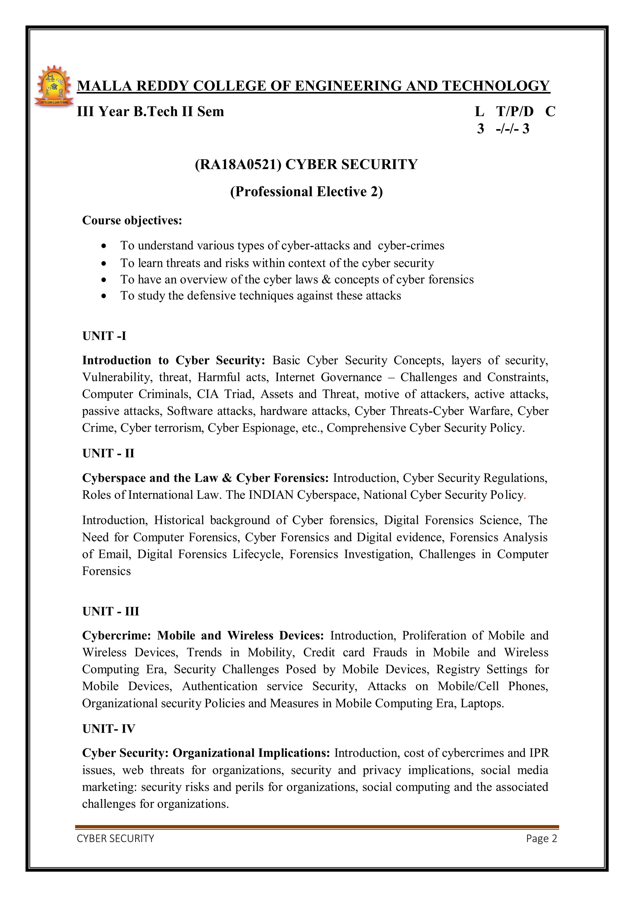 This document provides information about a course on cyber security for a B.Tech III year class. It includes the course objectives, a list of 5 units that will be covered in the class, and the expected learning outcomes. The units cover topics such as cyber security basics, cyber laws and forensics, cybercrimes related to mobile devices and organizations, and privacy issues. At the end, it provides references to textbooks and examples of cybercrimes that will be discussed as mini cases.