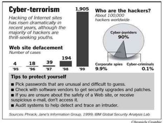 The document discusses different perspectives on the threat of cyberterrorism. It explores what cyberterrorism means, who the main perpetrators may be, and how countries can prevent attacks. While some see al-Qaeda as the primary threat, others argue that China poses a greater risk as it becomes more powerful and seeks to surpass the US. The document warns that cyberterrorism could become a serious global threat in the future as critical infrastructure and information systems become more connected and vulnerable to attacks.
