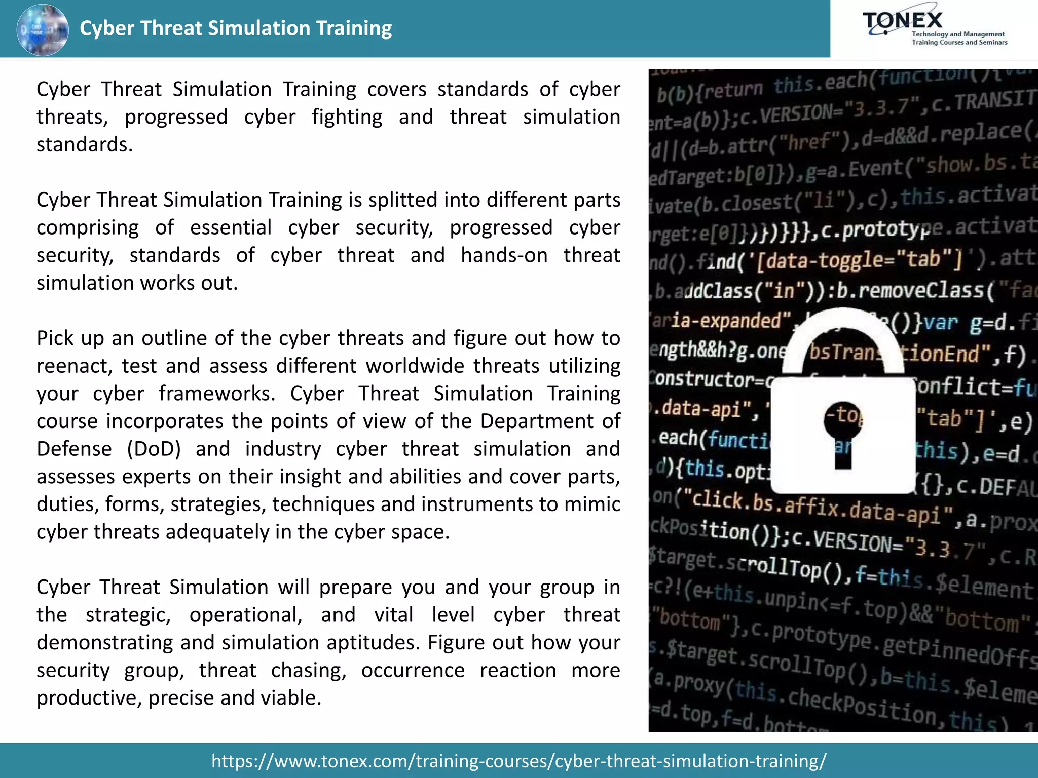 The Cyber Threat Simulation Training offered by Tonex is a comprehensive 3-day course priced at $3,999, focusing on the principles of cyber threats and threat simulation techniques. It covers essential topics such as cyber threat modeling, incident detection, and response strategies tailored for professionals like cyber threat analysts and law enforcement officials. Participants will gain practical skills in simulating, testing, and mitigating cyber threats using various tools and methodologies endorsed by the Department of Defense.