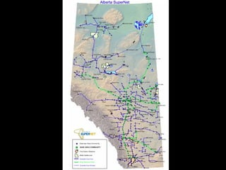 The document discusses the growing but uneven demand for high-speed internet access across academic, urban, and rural communities. It notes that access to the internet is increasingly viewed as a basic right and necessity for economic development and innovation. The document also examines options for improving connectivity in rural areas like Olds, Alberta through new network infrastructure models that could provide high-speed internet access to all homes and businesses.