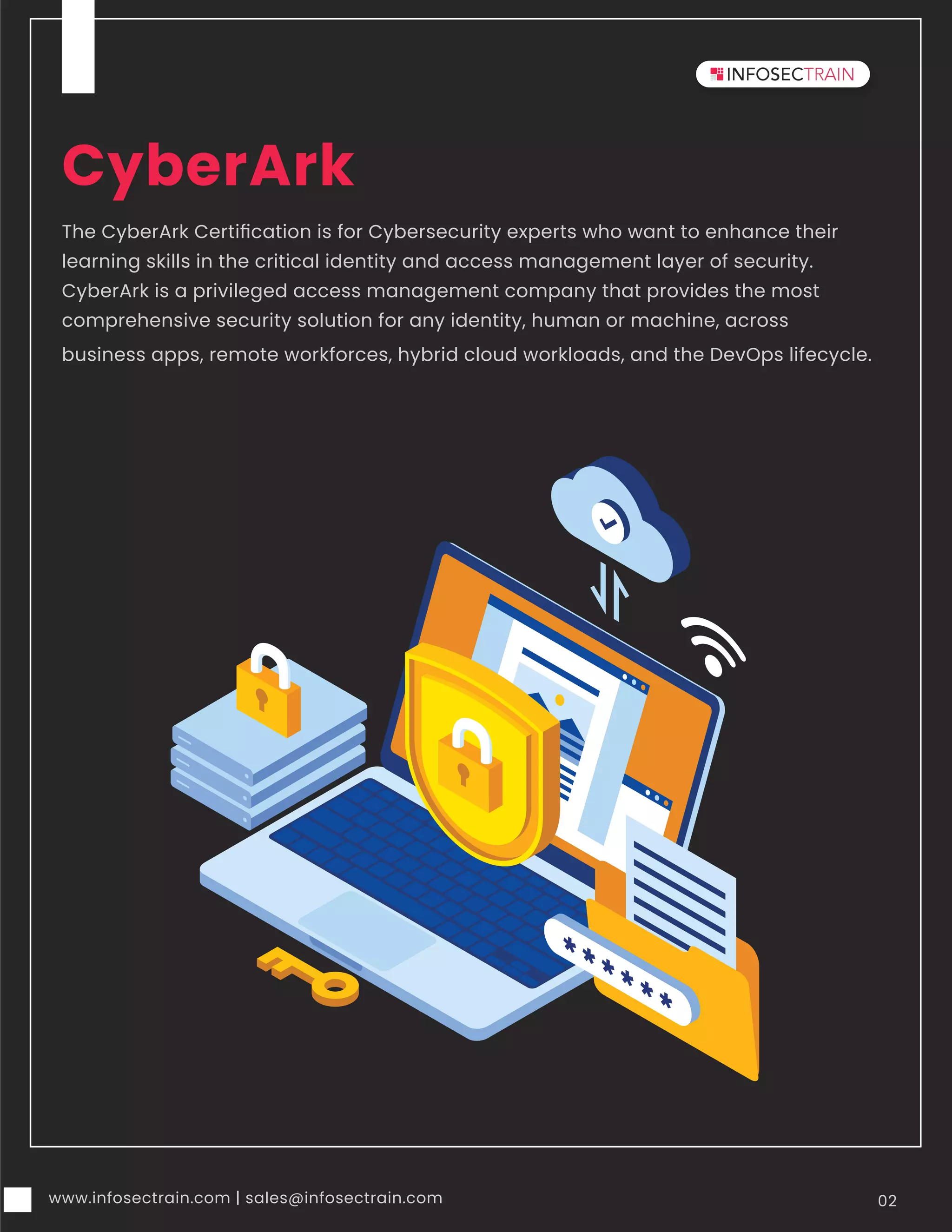 The document provides an overview of CyberArk, a privileged access management system that enhances security for managing sensitive accounts, passwords, and devices. It includes key features such as the enterprise password vault, privileged session manager, and various components related to identity and access management. Additionally, it outlines pivotal questions and responses regarding CyberArk's functionality and implementation in a security context.
