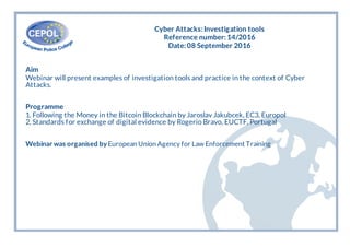 Sokratis Marioglou of the Hellenic Police in Greece attended a CEPOL webinar on September 8, 2016 about cyber attack investigation tools. The webinar presented examples of investigation tools and practices for cyber attacks and included a presentation on following money in the Bitcoin blockchain and standards for exchanging digital evidence. The webinar was organized by the European Union Agency for Law Enforcement Training.
