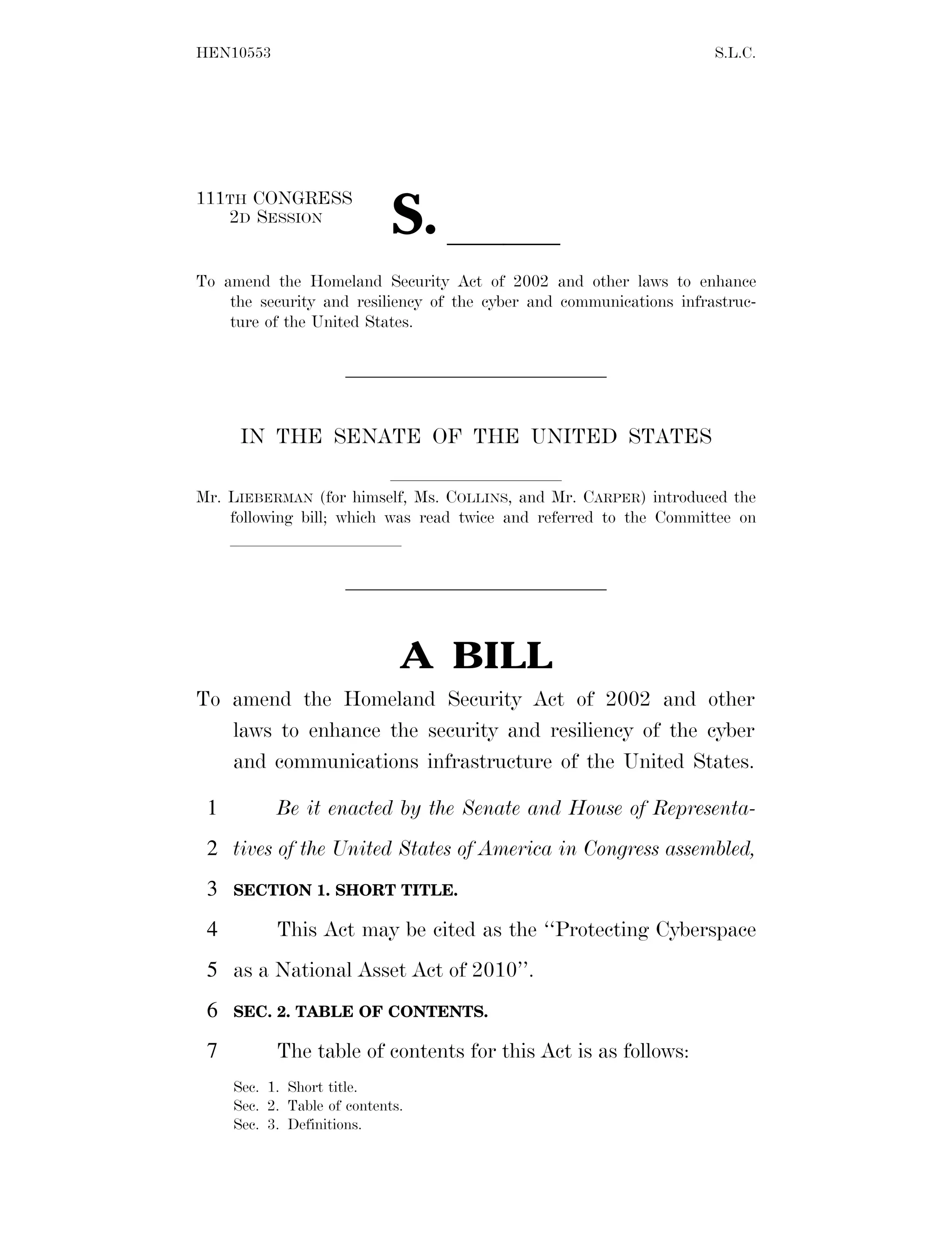This document is a bill introduced in the Senate to amend homeland security laws and enhance the security and resiliency of the United States' cyber and communications infrastructure. It proposes establishing an Office of Cyberspace Policy within the Executive Office of the President to develop a national cybersecurity strategy, oversee federal cybersecurity policies and activities, and ensure federal agencies share relevant security information. It also proposes establishing a National Center for Cybersecurity and Communications and makes various changes to federal information security management, cybersecurity workforce development, and other cybersecurity provisions.