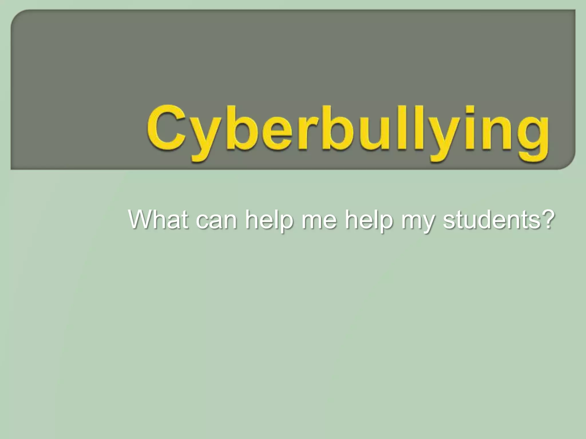 The document discusses ways for teachers to help address cyberbullying among students. It notes that cyberbullying involves inappropriate use of technology to harass or threaten others. Many students ages 8-15 experience cyberbullying through means like cell phones, social media, and more. The impacts on victims can include truancy, depression, and sometimes suicide. While laws and policies aim to address cyberbullying, more research is still needed on effective prevention and intervention methods. The document provides guidance for teachers on creating a classroom technology policy to help prevent cyberbullying and set clear expectations and consequences for inappropriate technology use among students.