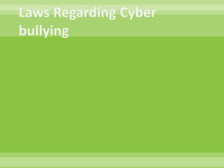 The document discusses cyberbullying and provides tips to address it. It defines cyberbullying as tormenting, threatening, harassing, humiliating, or embarrassing another person online or through digital technologies. Some signs that a student may be cyberbullied or bullying others include being frequently online late at night, becoming upset about computer access, or showing signs of anger or depression after using technology. The document recommends teaching students to not send harmful messages, to delete suspicious emails, and to tell trusted adults about any bullying they experience or witness.