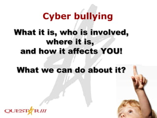 Cyber bullying involves using electronic means like email, text messages, social media to harass, threaten or embarrass someone. It is a growing problem, especially among teenagers who have widespread internet access. Some signs of cyber bullying include sadness after internet use or declining school performance. While some teens see it as harmless, it can have serious consequences like suicide. Educators need to teach safe internet use, communicate with students and parents, and work with authorities if threats are made to help address this issue.