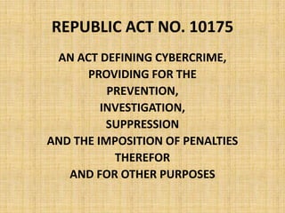 The document outlines Republic Act No. 10175, also known as the Cybercrime Prevention Act of 2012, which defines and penalizes cybercrimes such as illegal access, cybersex, and libel. It establishes the Cybercrime Investigation and Coordinating Center to investigate cybercrimes and allows law enforcement to collect traffic data with a court order. The law was controversial due to introducing internet libel as an offense and was temporarily blocked by the Supreme Court.
