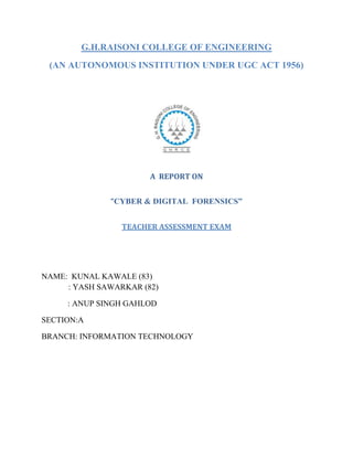 This document is a report on cyber and digital forensics submitted by three students from G.H. Raisoni College of Engineering in Nagpur, India. The report discusses digital forensic methodology, tools used in digital analysis like Backtrack and Nuix, techniques such as live analysis and analyzing deleted files, analyzing USB device history from the Windows registry, and concludes that digital forensics is an evolving field with no set standards yet and constant updates are needed to investigate modern cyber crimes.