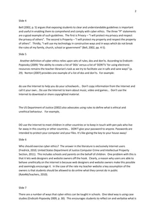 The document discusses the importance of teaching cyber ethics to internet users, particularly students, emphasizing the need for responsible and ethical behavior online. It highlights case studies of unethical online behavior, such as anonymous ratings of teachers, and presents definitions and methods for teaching cyber ethics, including the creation of guidelines and school policies. Additionally, it critiques reliance on bans and filtering as sufficient solutions to teach online behavior, advocating for personal responsibility and understanding of consequences instead.