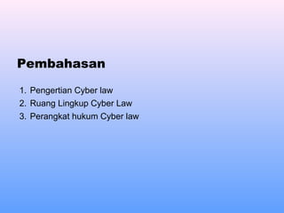 Dokumen ini menjelaskan tentang pengertian dan ruang lingkup cyber law di Indonesia, termasuk istilah yang digunakan dan aspek hukum yang terkait dengan aktivitas di internet. Cyber law mencakup berbagai isu seperti hak cipta, privasi, dan perlindungan konsumen, serta memerlukan perundang-undangan yang dapat mengatur transaksi dunia maya secara efektif. Selain itu, dokumen ini juga membahas kebijakan dan perangkat hukum nasional serta internasional yang diperlukan untuk menangani kejahatan siber dan pengaturan kegiatan di ruang siber.